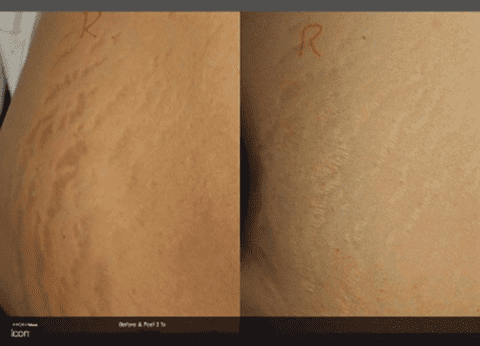 At Regenesis, the 1540 Palomar Icon Fractional laser is used to treat stretch marks. Laser energy penetrates the dermis triggering a production of collagen and elastin which helps the scars heal, smooth, and fade. Laser treatment is more effective in treating newer stretch marks. The red and pink color of newer stretch marks indicate there are active blood vessels in the skin, which allow for quicker and more complete healing following laser treatment. The older, white striae are more difficult to treat and require more sessions due to their lack of blood vessels, since less collagen is formed. IPL phototherapy is particularly effective in fading red and purple marks. vent progression into white/silvery marks.